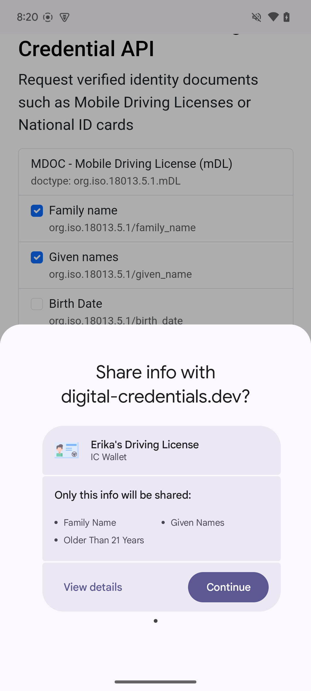 在此示例中,系统使用 "openid4vp" 协议请求了凭据,并且响应中的 data 属性包含 "vp_token"。如需了解如何解析响应并验证凭据,请参阅 W3C 数字凭据 API 的 OpenID for Verifiable Presentation (OID4VP) 规范。