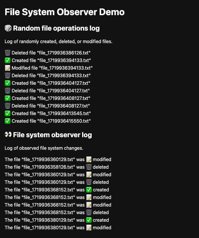 एम्बेड किए गए डेमो में, File System Observer API को काम करते हुए देखा जा सकता है. सोर्स कोड देखें. डेमो, मॉनिटर की जा रही डायरेक्ट्री में फ़ाइलों को बनाता है, मिटाता है या उनमें बदलाव करता है. साथ ही, ऐप्लिकेशन विंडो के ऊपरी हिस्से में अपनी गतिविधि को लॉग करता है. इसके बाद, यह ऐप्लिकेशन विंडो के निचले हिस्से में होने वाले बदलावों को लॉग करता है. अगर आपने इस जानकारी को ऐसे ब्राउज़र पर पढ़ा है जो File System Observer API के साथ काम नहीं करता, तो डेमो का स्क्रीनशॉट देखें.