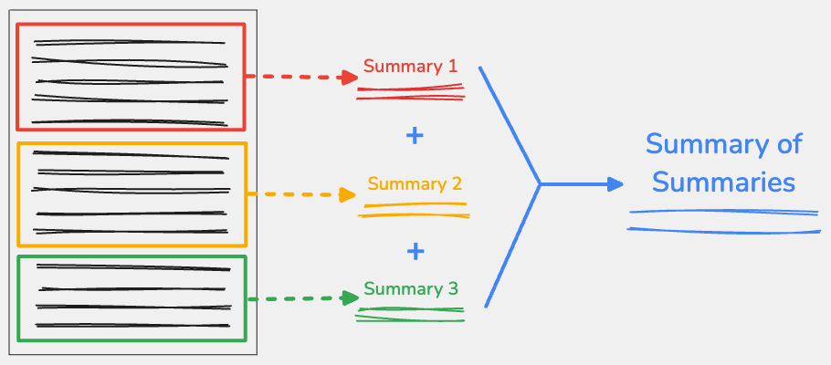 Ví dụ: nếu một tài liệu được chia thành 3 phần, thì mỗi phần sẽ được tóm tắt. Ba bản tóm tắt đó được kết hợp và tóm tắt lại để đưa ra kết quả cuối cùng.