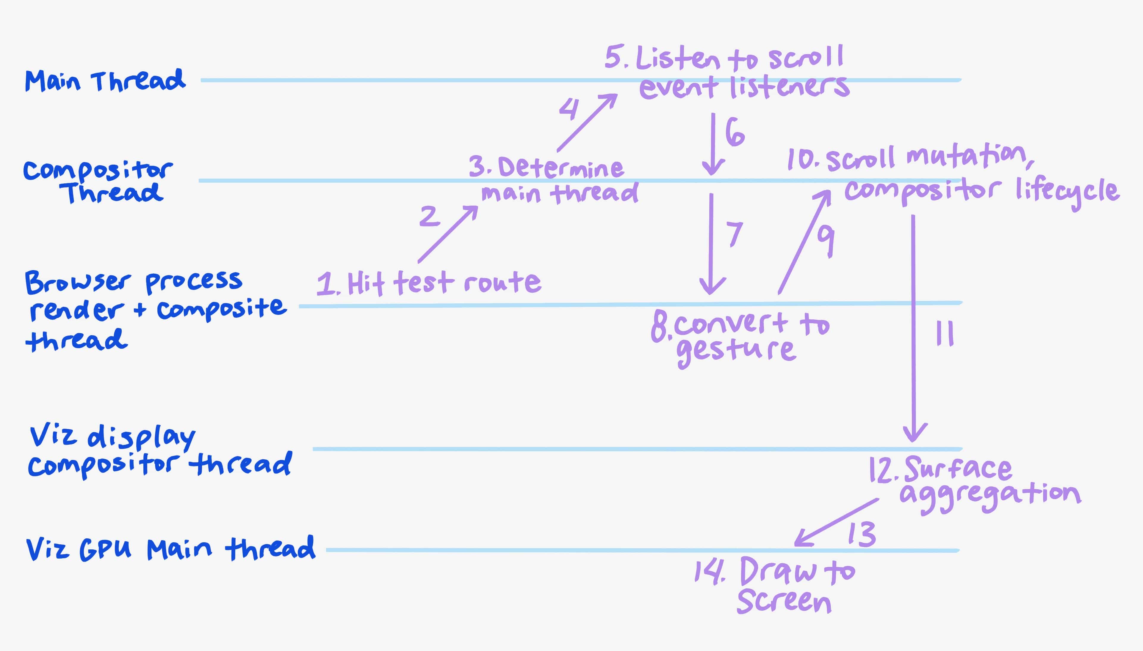5. يُشغِّل الخيط الرئيسي أدوات معالجة أحداث input (pointerdown أو touchstar أو pointermove أو touchmove أو wheel) لمعرفة ما إذا كانت أدوات المعالجة ستستدعي preventDefault في الحدث.