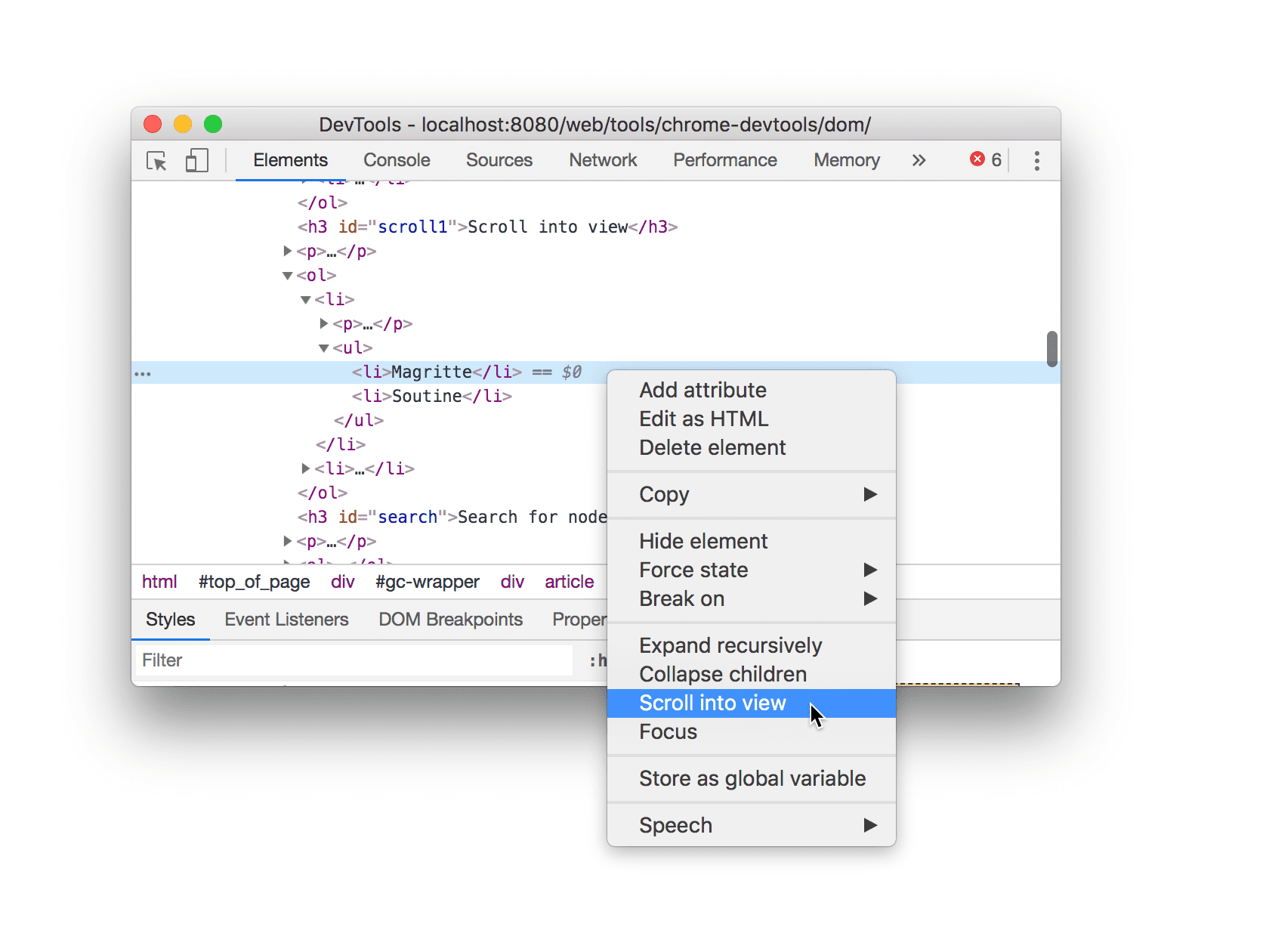 <li>Magritte</li>node should still be selected in your DOM Tree. If not, go back to Scroll into view and start over. Right-click the