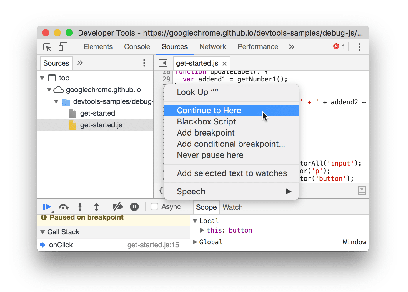 לוחצים לחיצה ימנית על שורת הקוד הרצויה ובוחרים באפשרות Continue to here. DevTools מפעיל את כל הקוד עד לנקודה הזו, ואז מושהה בשורה הזו.