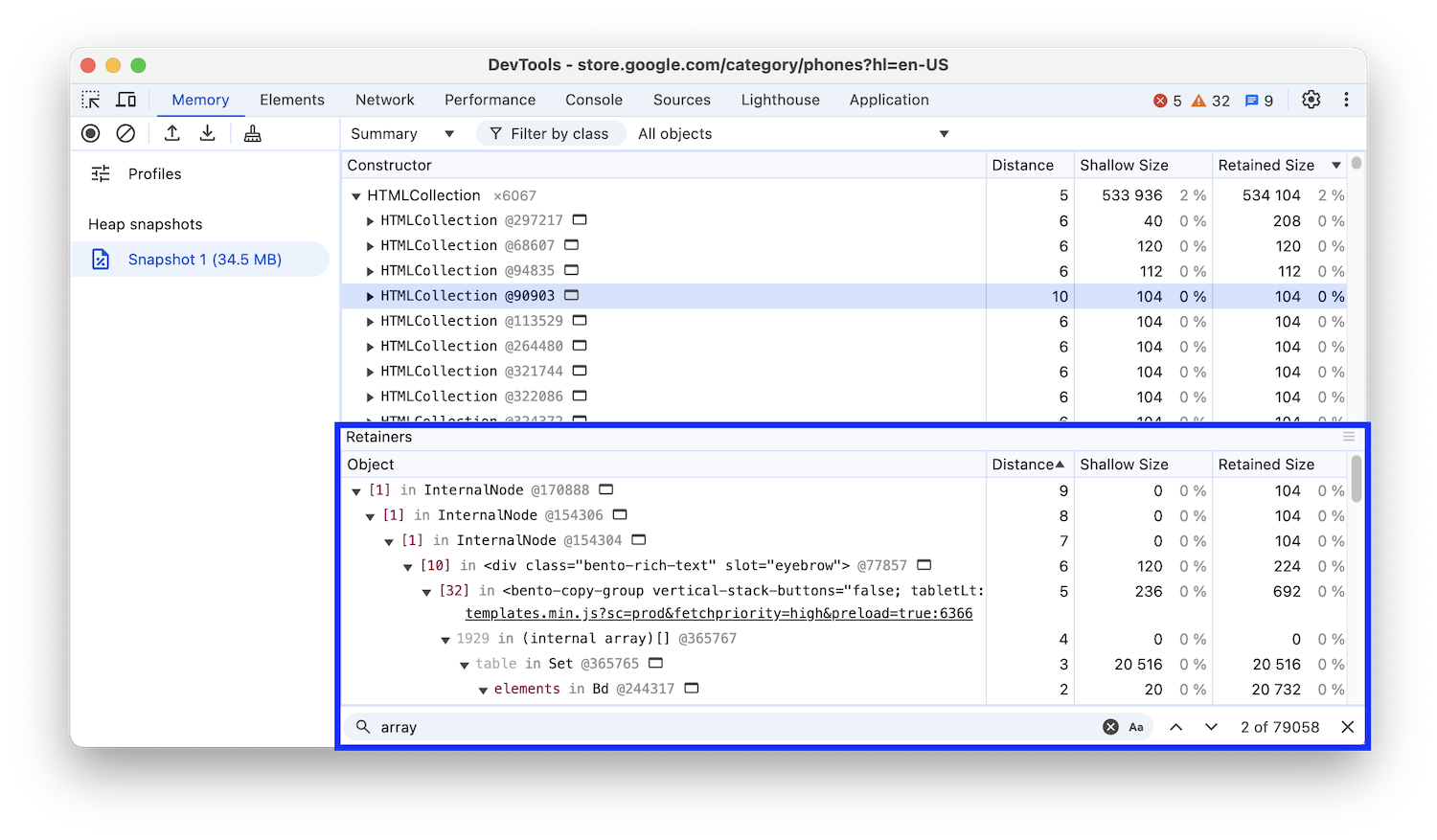 Die hier beschriebenen Begriffe beziehen sich auf den Heap-Profiler in den Chrome-Entwicklertools. Wenn Sie schon einmal mit dem Java-, .NET- oder einem anderen Speicher-Profiler gearbeitet haben, ist dies möglicherweise eine Auffrischung.