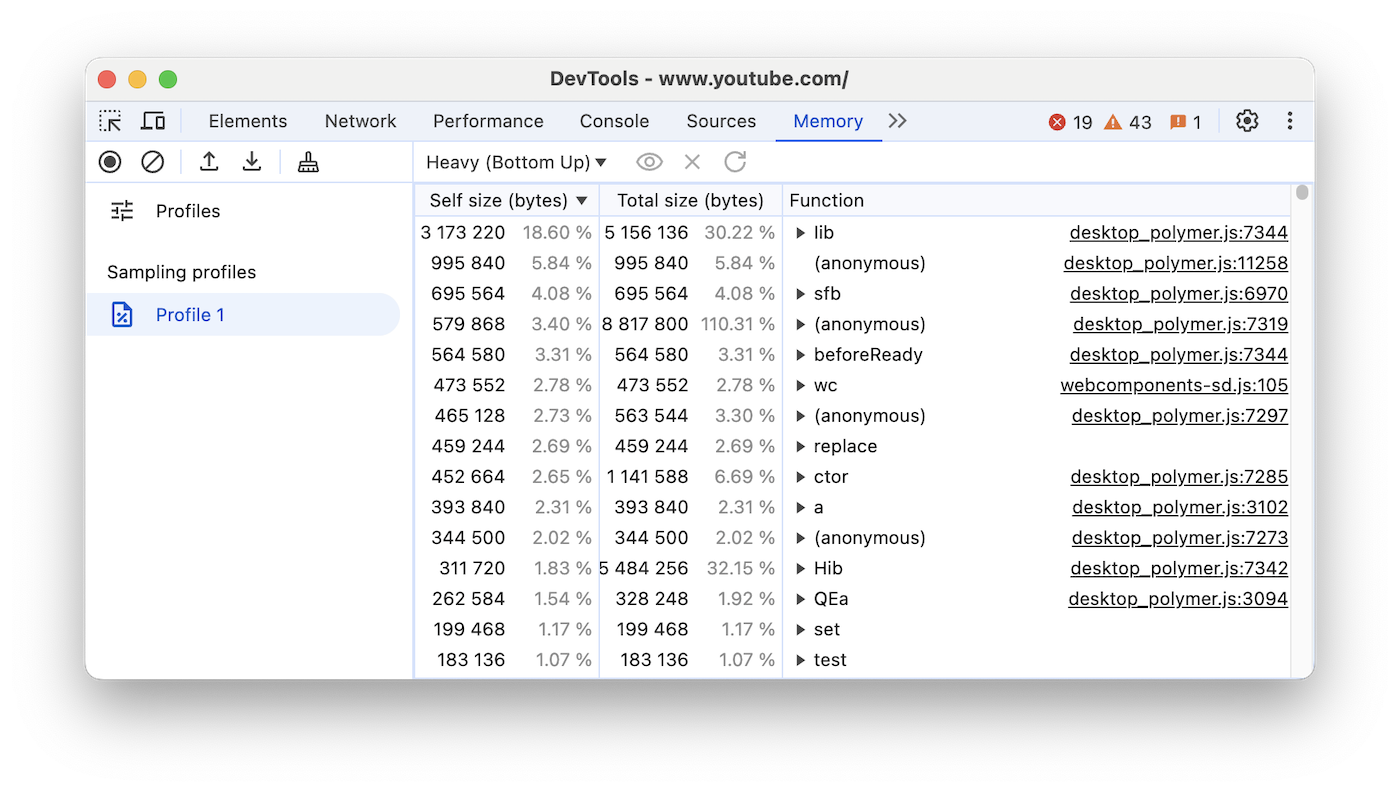 Gunakan jenis profil Pengambilan sampel alokasi di panel Memori untuk melihat alokasi memori menurut fungsi JavaScript.