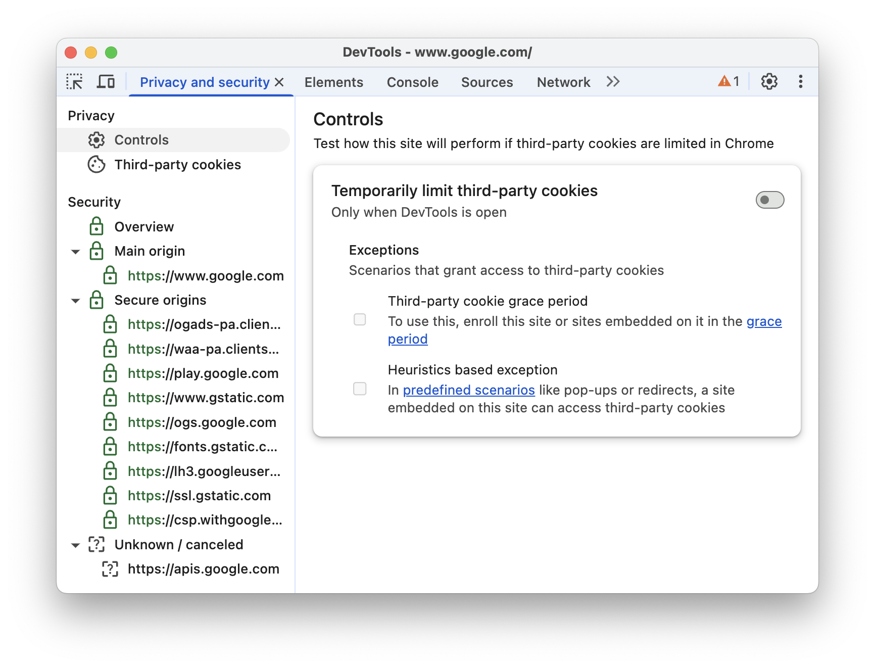 Utilizza il riquadro Privacy e sicurezza in Chrome DevTools per ispezionare e controllare i cookie di terze parti e verificare la protezione HTTPS.