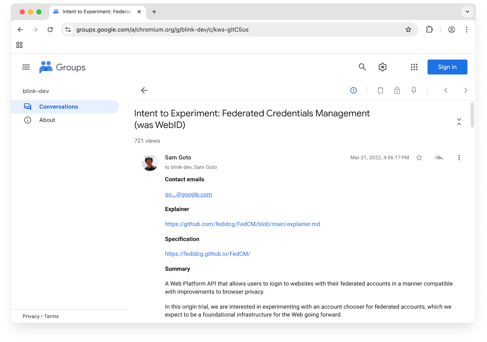 Une fois qu'une proposition comme FedCM est prête à être discutée publiquement, elle est publiée sur GitHub en tant qu'explication. À ce stade, n'importe qui peut poser une question ou faire un commentaire sur la conception d'une fonctionnalité en créant un problème dans le dépôt d'explications sur GitHub. Les commentaires peuvent décrire des cas d'utilisation ou des contraintes supplémentaires, fournir des idées d'amélioration ou simplement exprimer votre soutien.